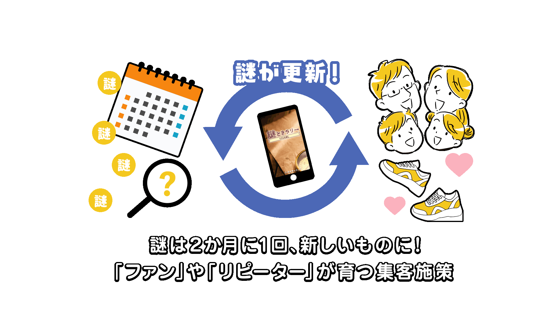 「この場所に行けば謎解きができる!」という印象を定着させ、 定期的に入れ替わる謎を目的に参加するリピーターを着実に育てます。